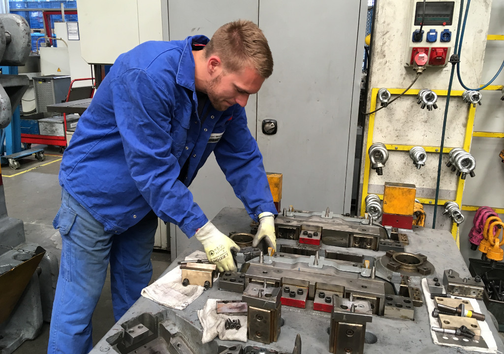 Wie sein Kollege Richard Klaus gehört der junge Mann aus Gera zum Werkzeugserviceteam. Vierzig Köpfe zählt es. Und achtzig flinke Hände, die häufig mit dem Nachschärfen der Schneidstempel der Pressen beschäftigt sind. Eine Routineaufgabe, die Klaus und Winterberg als Auszubildende im dritten Ausbildungsjahr längst selbstständig durchzuführen gelernt haben. Geschicklichkeit ist dabei ebenso gefragt wie Geschwindigkeit: „Wenn wir gerufen werden, kommen wir innerhalb von Minuten und beheben das Problem sofort“, erzählt Klaus, „denn unsere Mission ist es, Maschinenstillstände zu vermeiden beziehungsweise so kurz wie möglich zu halten.“