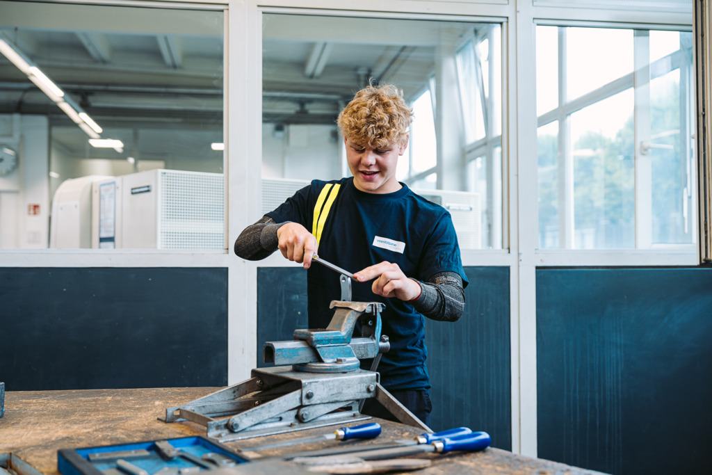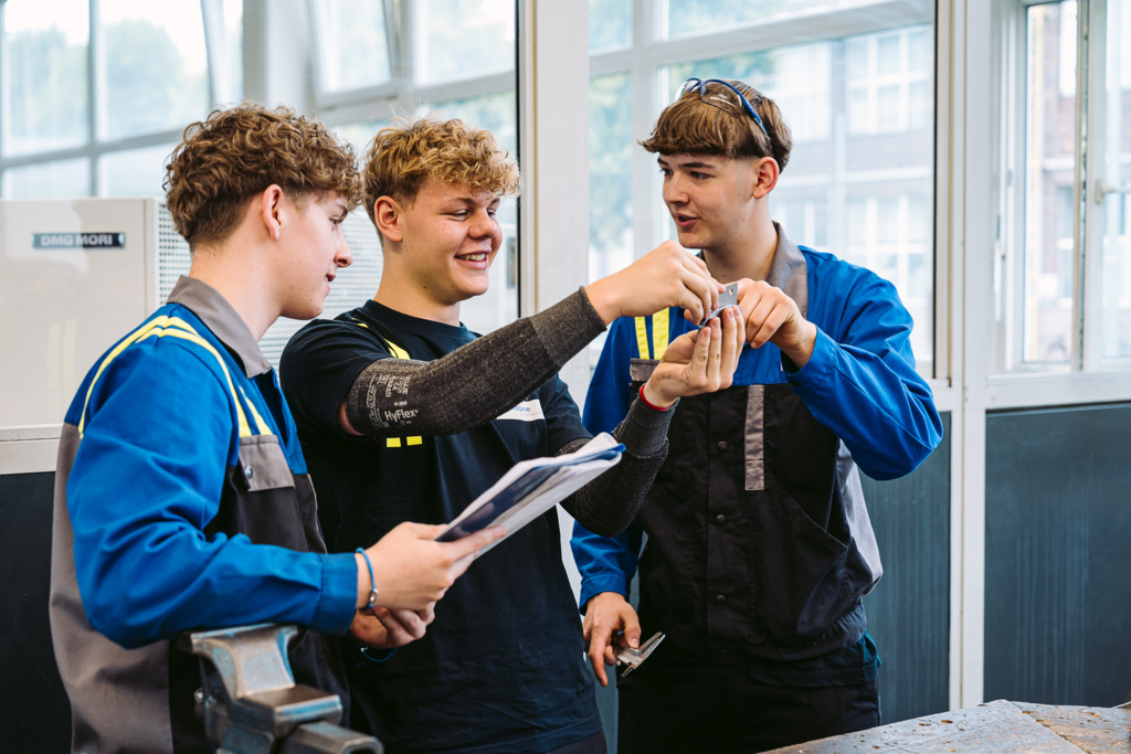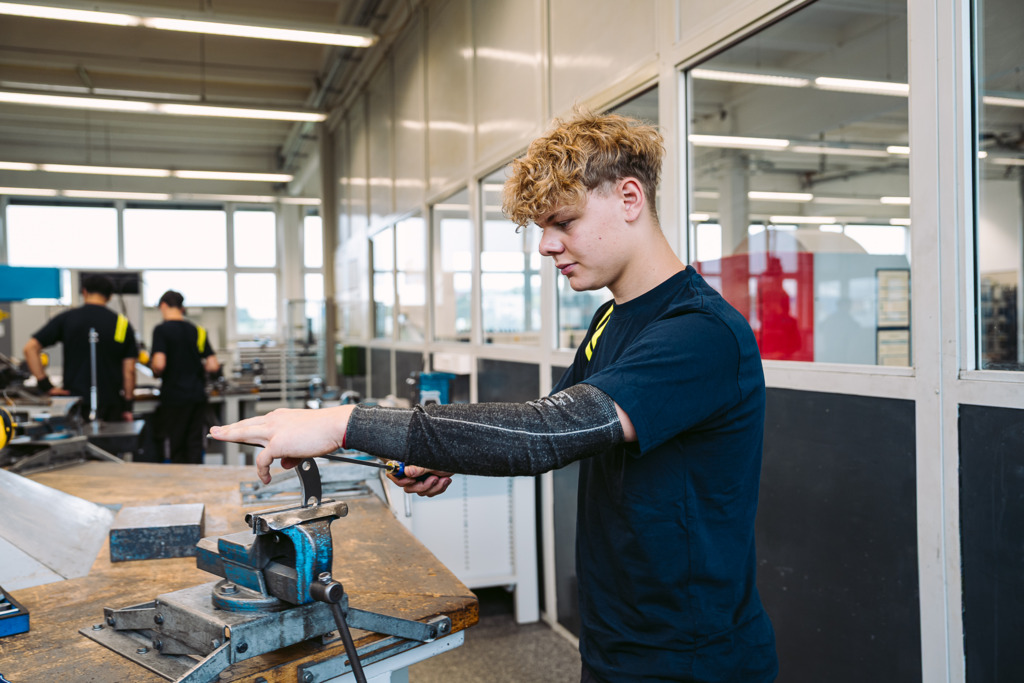 Durch die gemeinsame Grundausbildung mit allen neuen Technik-Lehrlingen haben sich rasch Freundschaften gebildet. Um 7:15 Uhr morgens geht es für sie los. Nach den Sicherheitsunterweisungen arbeiten die Lehrlinge direkt durch Fräsen, Drehen oder Bohren von Hand an den Übungswerkstücken weiter, die die Ausbilder ihnen zuvor erklärt haben.