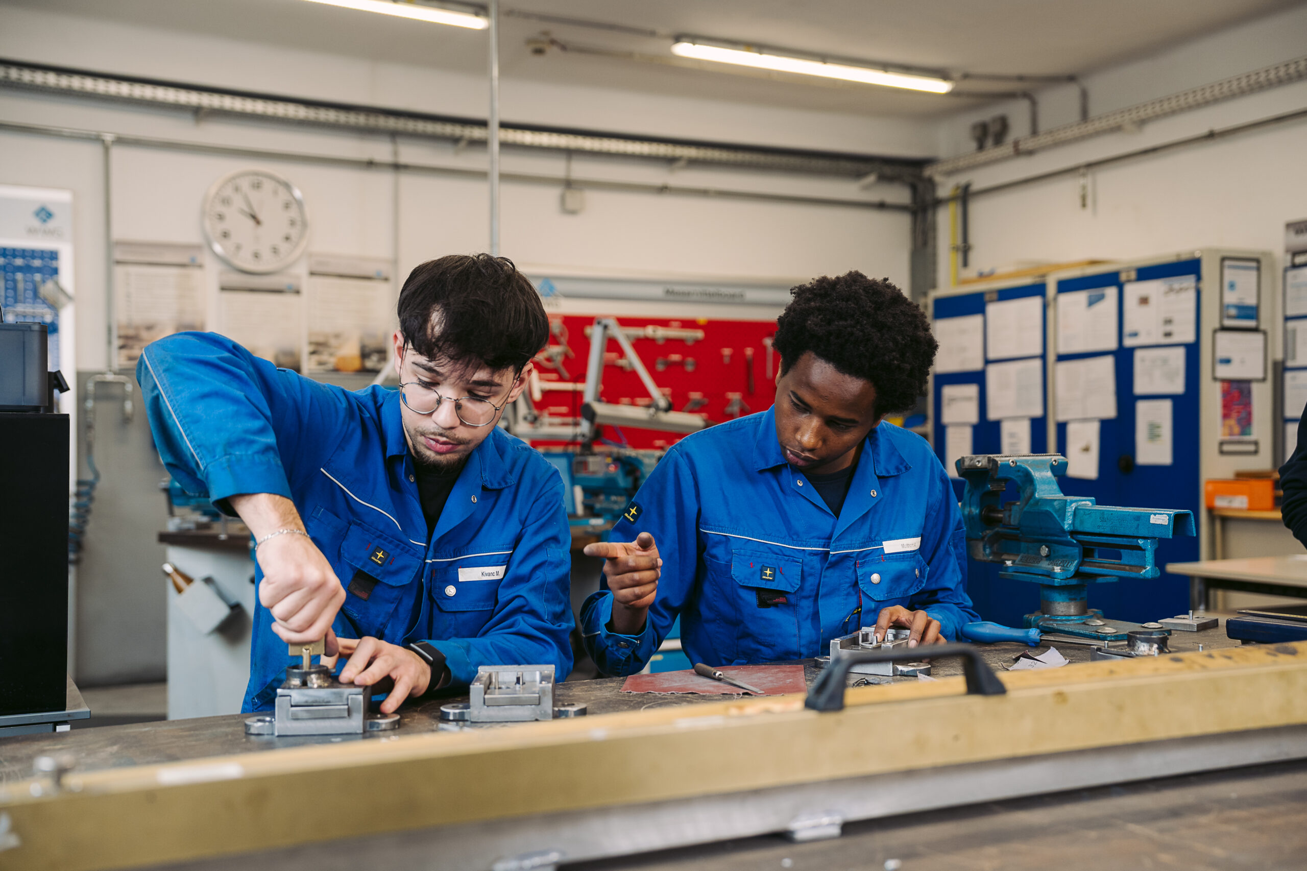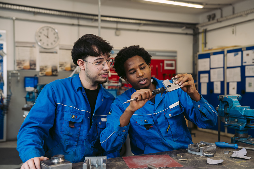 Die Ausbildung beginnt mit Grundlagen wie Feilen und Fräsen. Ab dem zweiten Lehrjahr durchlaufen die Lehrlinge verschiedene Abteilungen und können sich nach der Lehrabschlussprüfung für einen Bereich entscheiden.