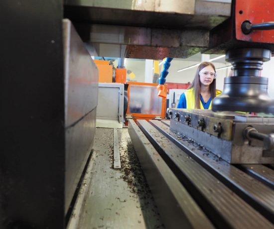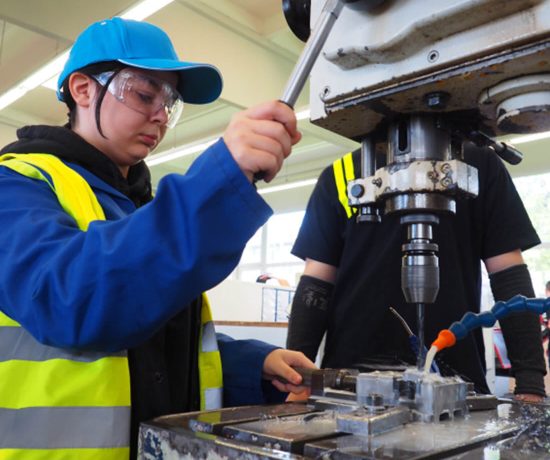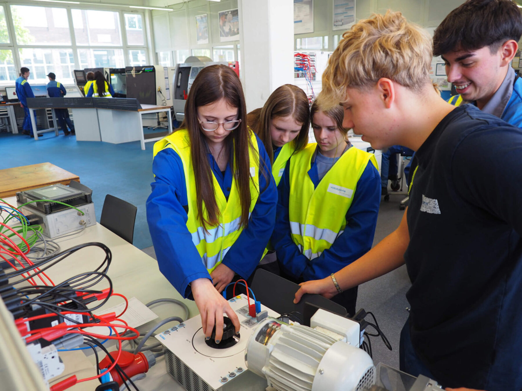 In unserer Lehrwerkstätte konnten sie sich an verschiedenen Stationen ein genaueres Bild über die unterschiedlichen Berufe und Tätigkeiten machen. Einige davon probierten sich unter Anleitung der Ausbilder:innen gleich selbst aus: Feilen, Anreißen, Bohren, Fräsen, CNC, Pneumatik, Schweißen, Robotik und Elektrotechnik – und die Mädchen stellten schließlich ein eigenes Werkstück her.