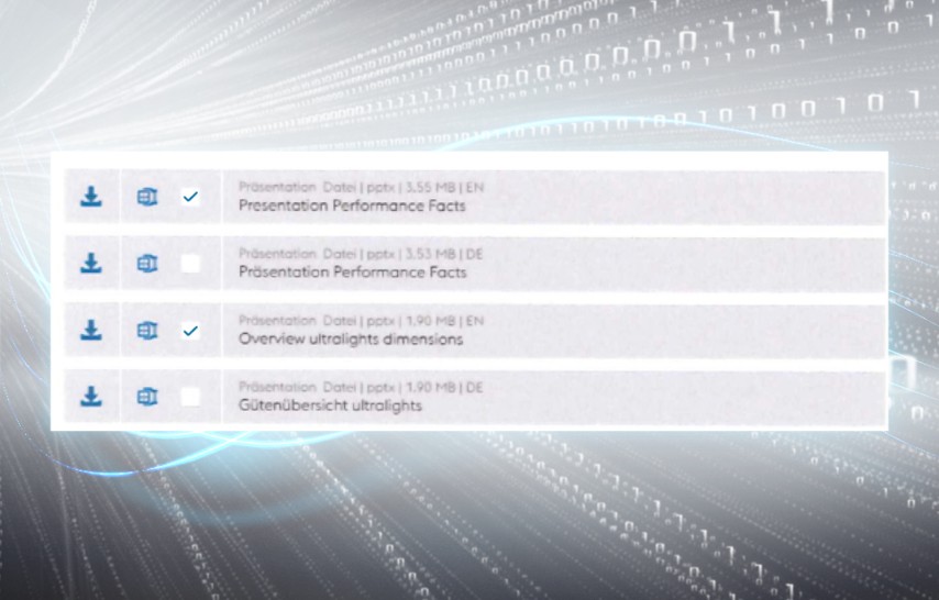 Einfach die Kontrollkästchen neben den Artikeln anklicken. Die gewünschten Dokumente finden Sie dann in Ihrem ZIP-Downloadbasket auf der rechten Seite. Dort können Sie sich direkt, schnell und einfach ein ZIP-File generieren.