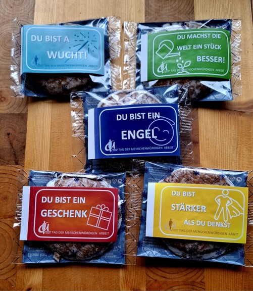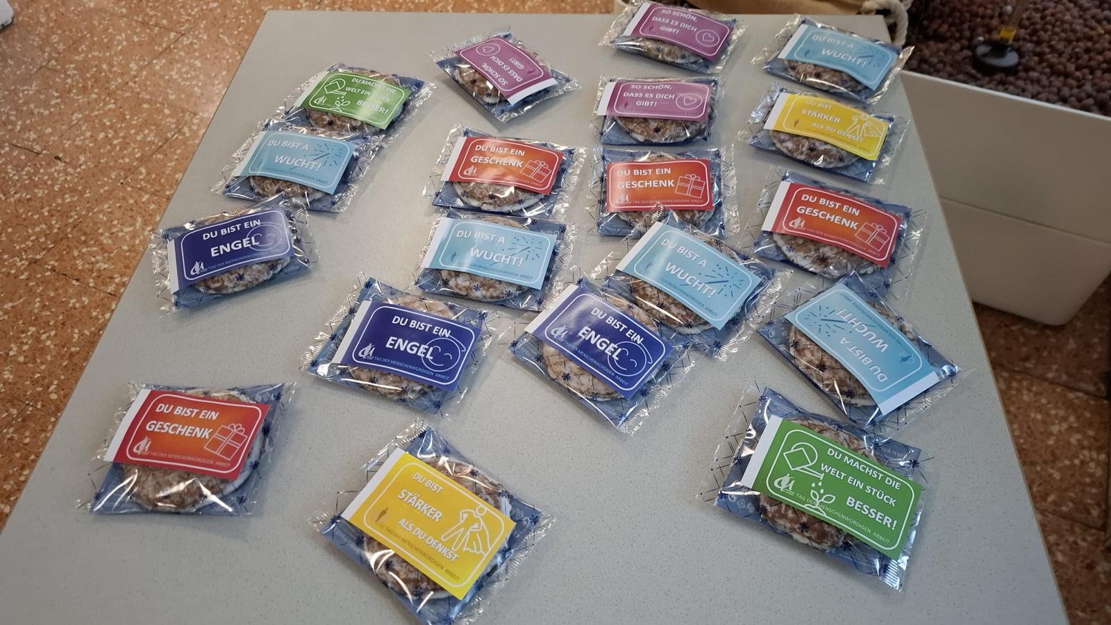 Der Beitrag und der Einsatz vieler Menschen haben diese tolle Aktion möglich gemacht: das nachgehende Seelsorgeteam mit dem Überlegen der passenden Sprüche; die Bastelrunde mit dem Bekleben der Lebkuchen mit den Aufklebern; das Hausteam mit der Verpflegung und Raumkoordination; Mitarbeiter:innen von Werkssicherung und Caselli, die uns unterstützen, sowie die 28 Verteiler:innen. Herzlichen Dank an euch alle! Durch euch wurde es möglich 6000 Stück Lebkuchen bestückt mit sechs unterschiedlichen Sprüchen zu verteilen und den Arbeitstag von sehr vielen Menschen zu bereichern!