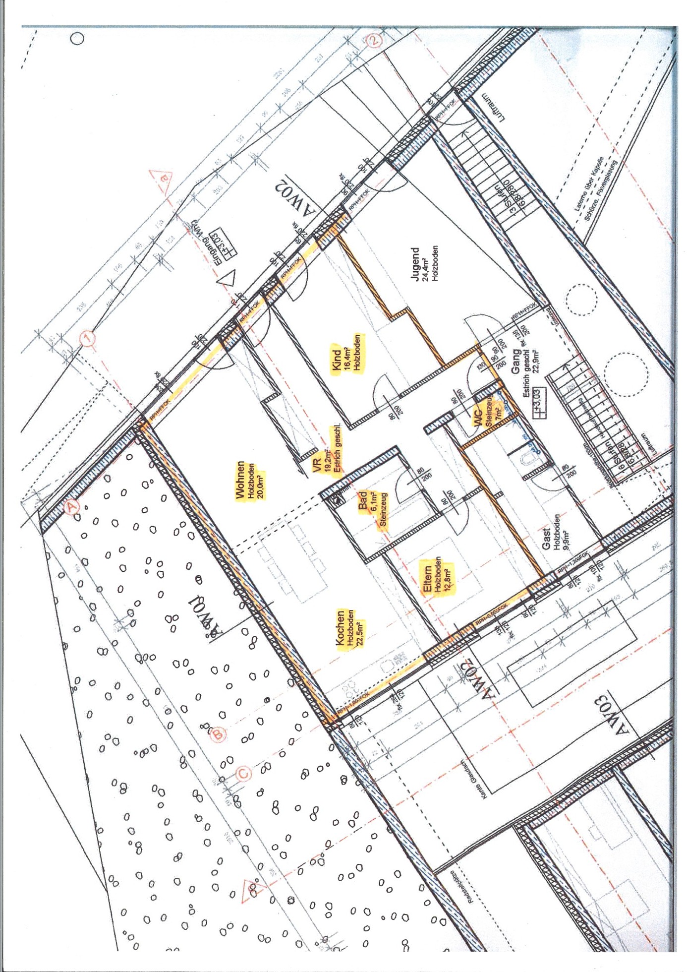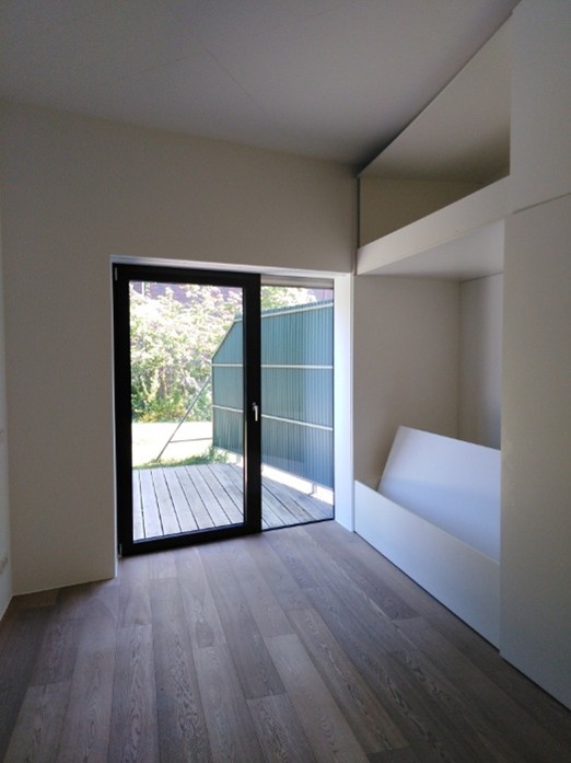 Diese liegt im 1. OG des Gebäudes und besteht aus Vorraum, Wohnraum mit kombiniertem Ess- und Kochbereich, WC mit Waschbecken, Bad mit Waschbecken, Duschkabine und Badewanne, Schlafzimmer, sowie einem Kinderzimmer/Büro mit einer Nutzfläche von insgesamt 99,00 m2.