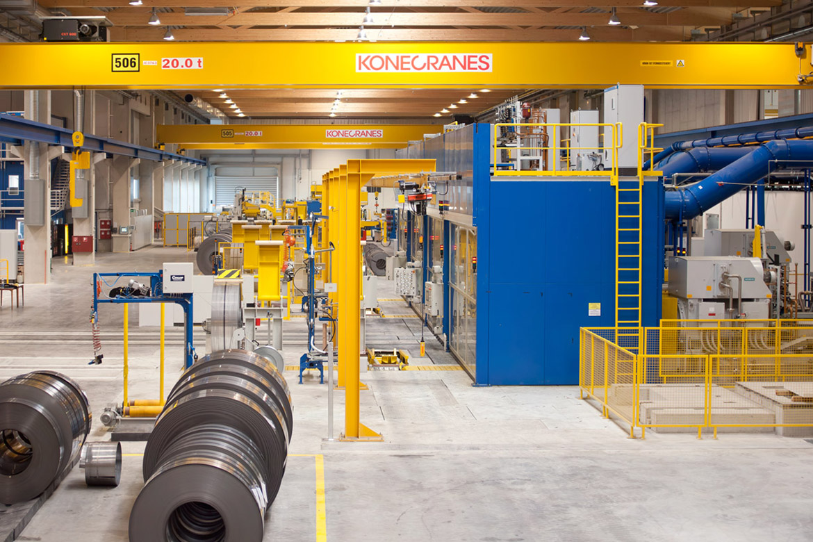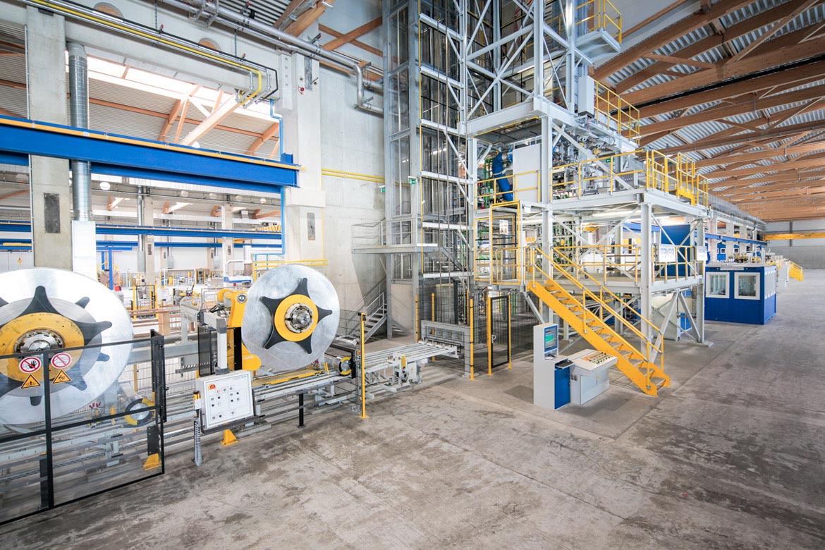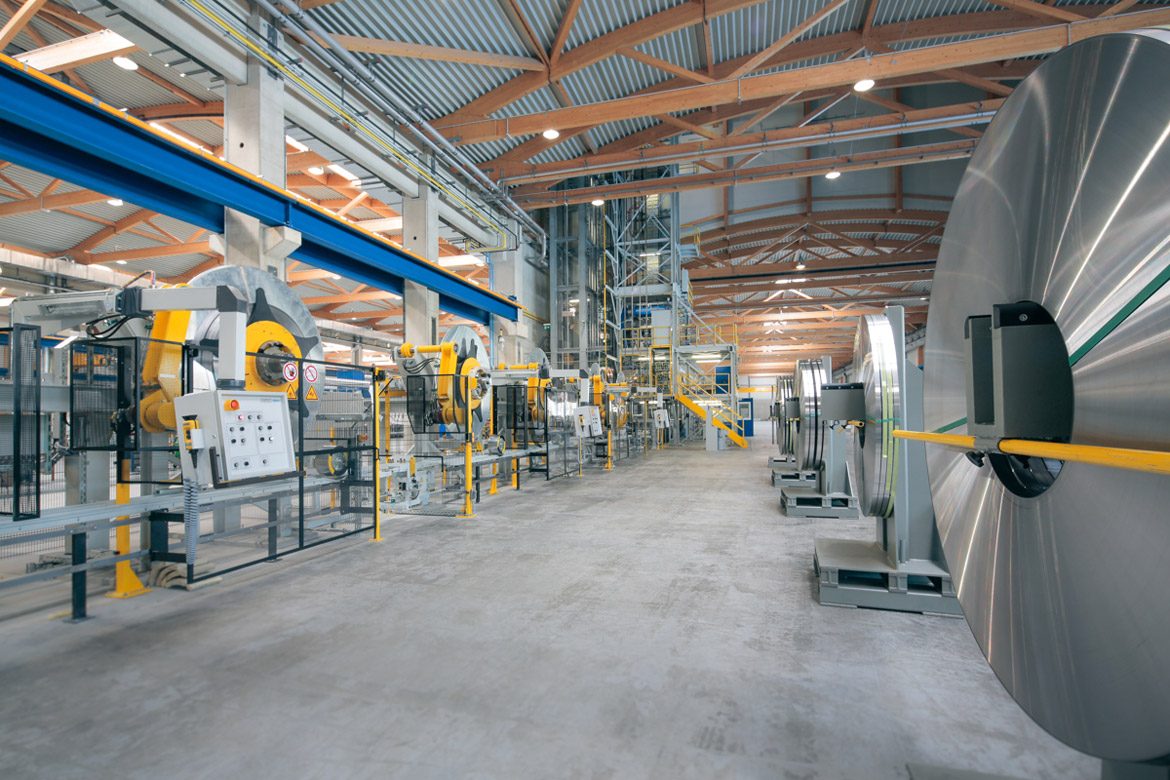 • The view into the buliding shows the size of the mill. The building with high heights and 280 wooden composite lumber and a lot of light is the perfect stage for the work with high precision strip steels.