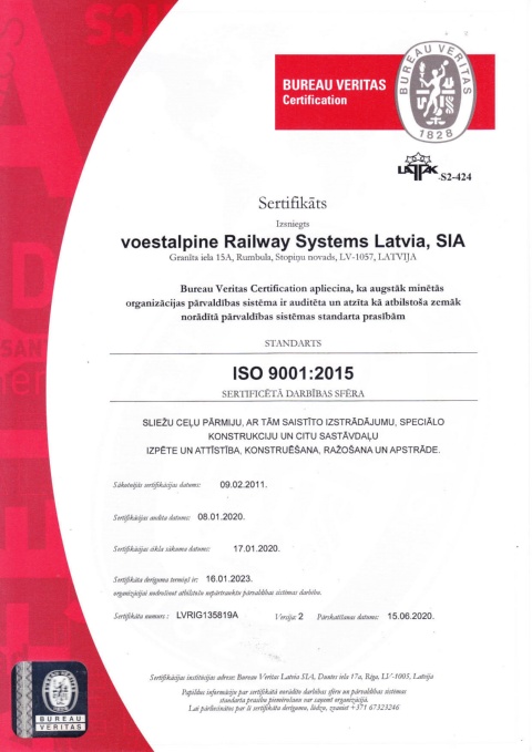 Uzņēmumam ir piešķirts ISO 9001:2015 standarts, kas apliecina mūsu klientiem to, ka mēs rūpējamies par savu preču un pakalpojumu kvalitāti, uzturot kvalitātes vadības sistēmu, periodiski izejot neatkarīgu auditoru pārbaudi un apliecinot sistēmas efektivitāti ar sertifikātu.
