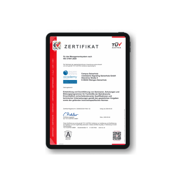 Unsere Experten am Campus Sainerholz teilen ihr Fachwissen über unsere innovativen Produkte mit Ihnen und helfen so, den Bahnverkehr effizienter und sicherer zu gestalten. Dabei geht der vermittelte Stoff weit über reine Produktinformationen hinaus. Mit unseren praxisnahen Trainings bleiben Sie auf dem technisch neuesten Stand. Profitieren Sie von unserem gebündelten Wissen als Competence Unit DLD/S (Kompetenzzentrum für Antriebs-, Weichenverschluss-, Endlagenüberwachungssysteme und Signaltechnikequipment) und erweitern Sie Ihre technischen Kompetenzen direkt aus erster Hand!