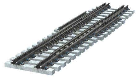 The REJ provides small and medium extension lengths (up to ±200mm) with movable switch rails, fixed stock rails, and continuous wheel overrun. The stock rails are fixed elastically on their outside and inside. The switch rails have an asymmetric rail profile and are guided in their movable part by guiding plates. The rail expansion joint is equipped with concrete or wooden sleepers for ballasted track, but is also suitable for slab track. Depending on the requirements, the rail expansion joint is provided with or without guard rails. With modifications, the rail expansion joint is suitable for heavy loads up to 35 tons axle load.